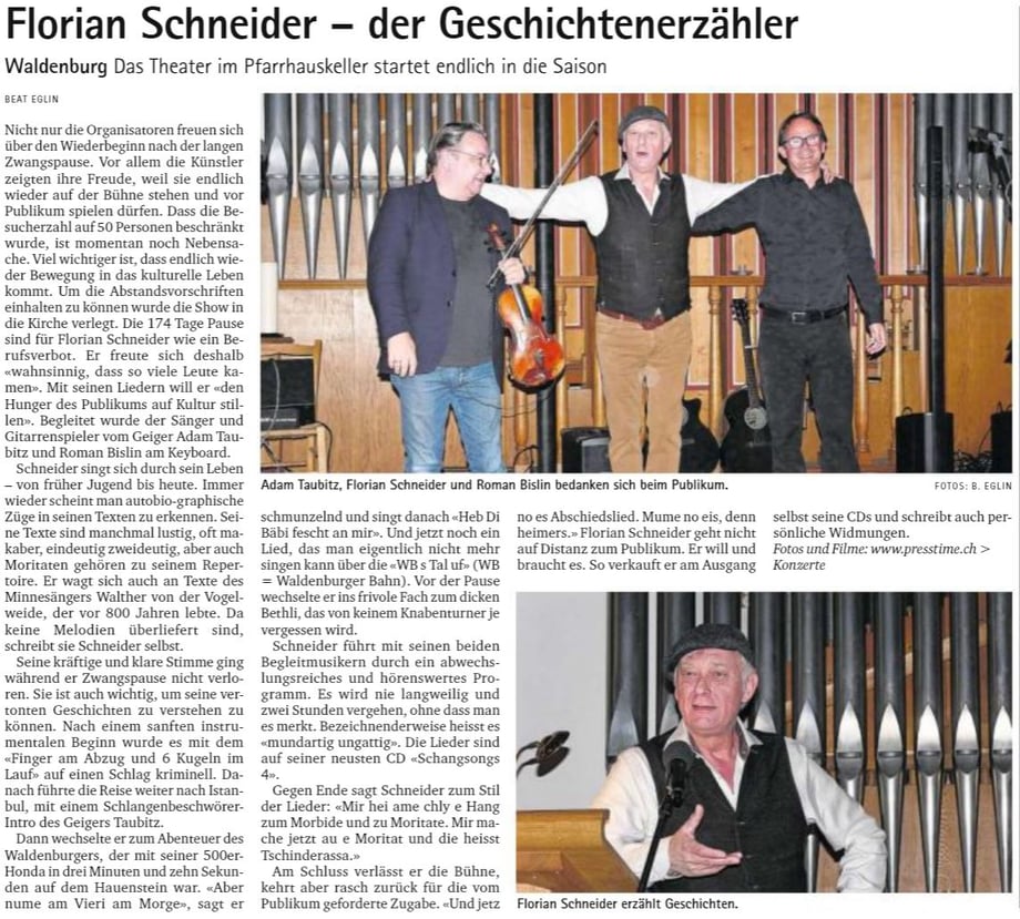 Am 3. Dezember 2016 gastierte der Baselbieter Chansonnier Florian Schneider mit seinem Musikerkollegen Adam Taubitz im Schlachthaus Laufen. Sie präsentierten Lieder aus der aktuellen CD Schangsongs. Taubitz begleitete Florians Stimme mit seiner Violine und zusammen mit den Texten ergab sich eine musikalisch-poetische Einheit.